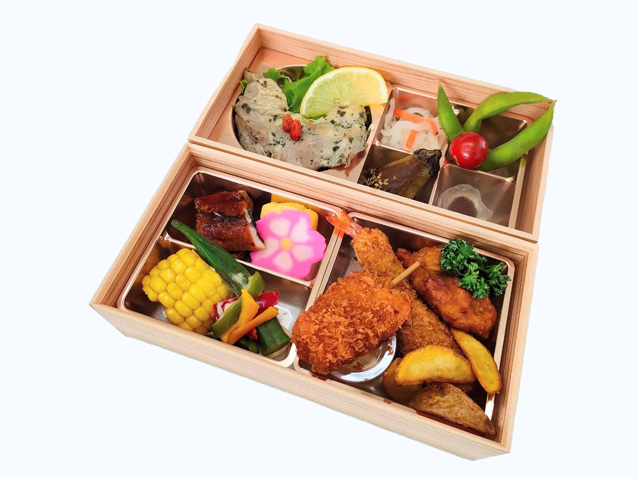鰻にエビフライ、串カツ、からあげ、レモンとハーブで味付けされた肉厚な鶏もも肉、とメインのおかずが盛りだくさんです。さらに、形の可愛いらしいナスみそ、バーニャカウダソースでいただくパプリカ等のお野菜等、本当にどこからいただこうか、迷ってしまいました。
